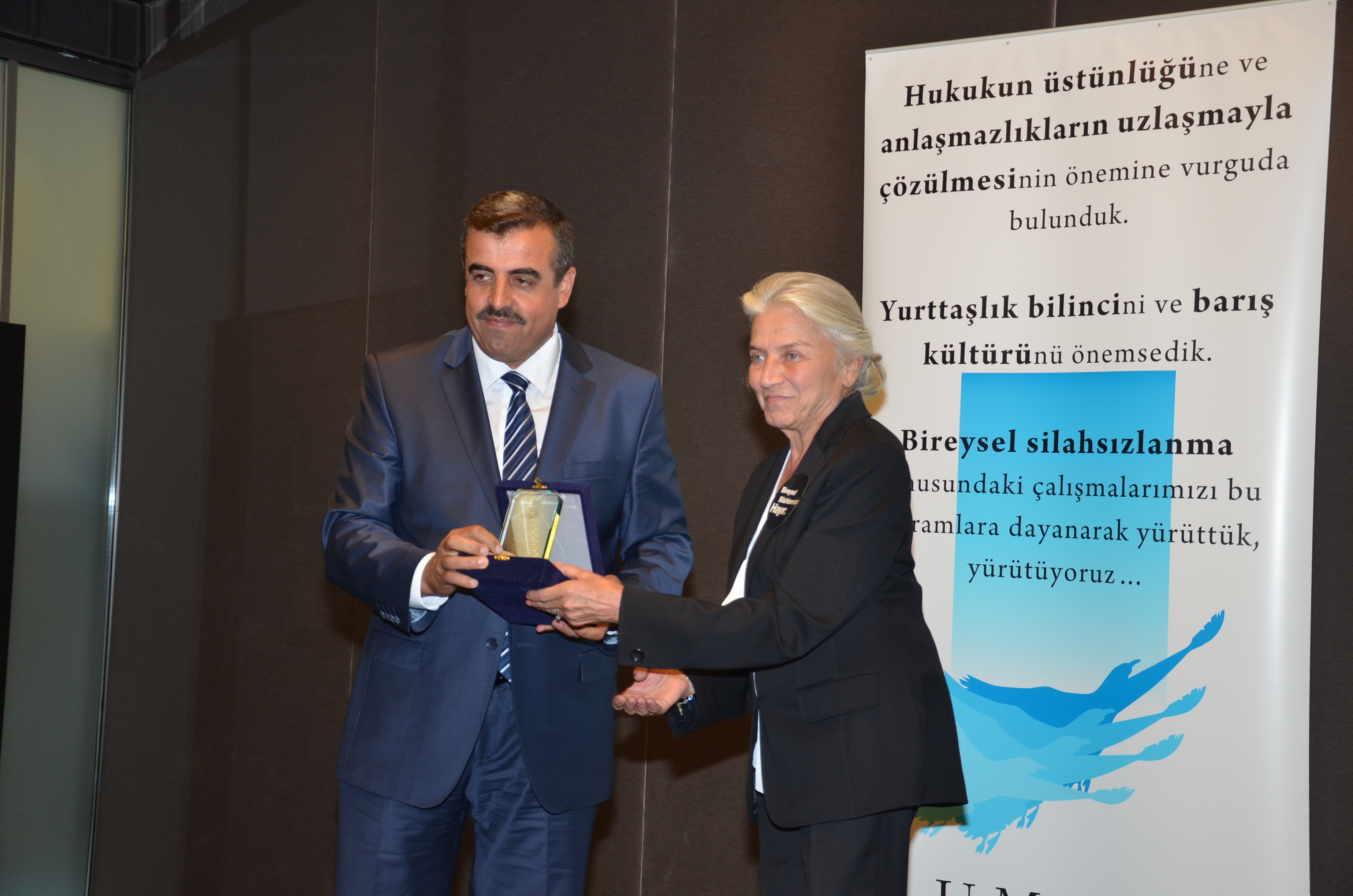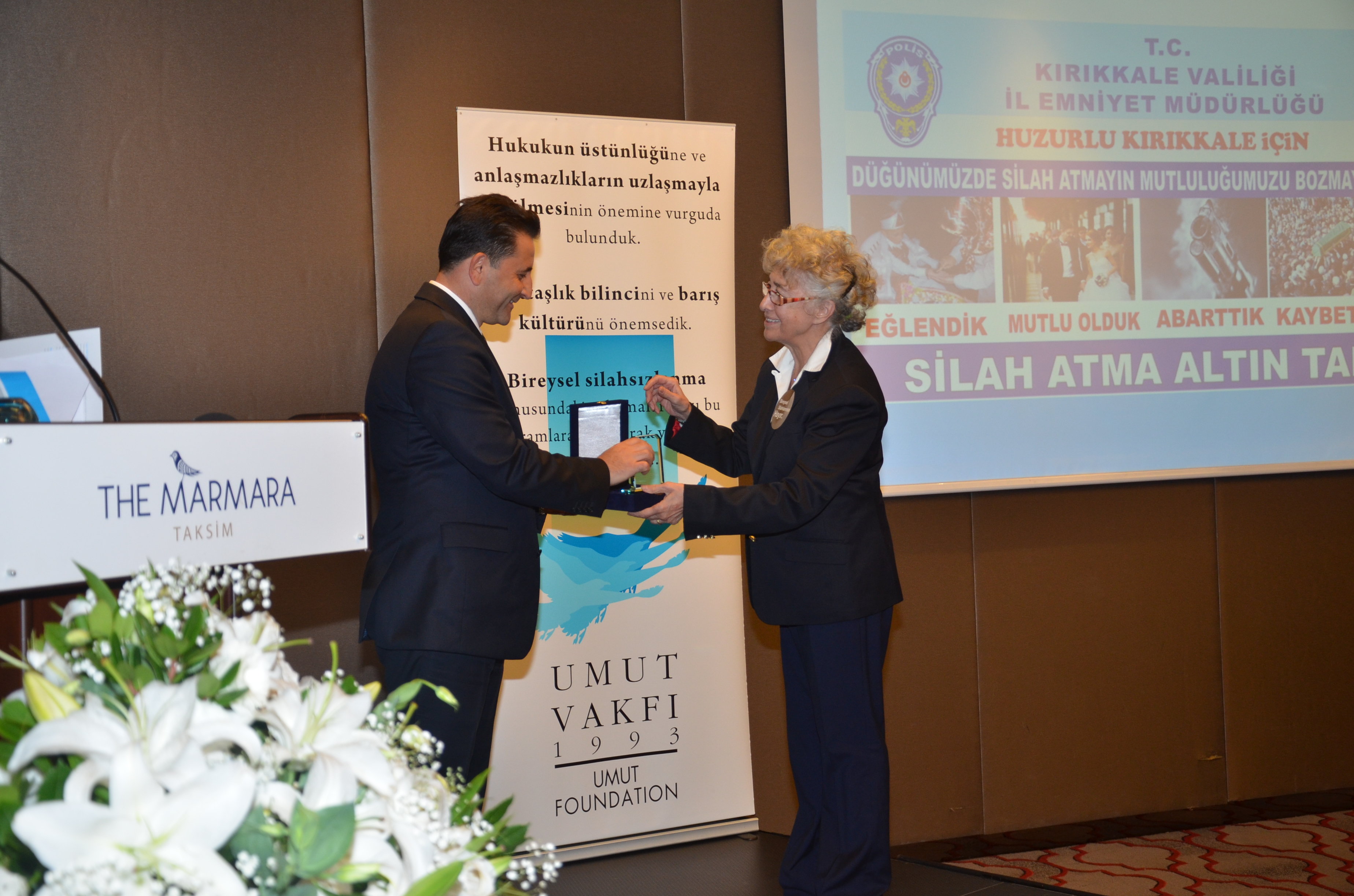 Törende Şanlıurfa’nın Elbistan ilçesinde yapılan düğün törenine "Düğünümüze Hoşgeldiniz Lütfen Silah Sıkmayınız" pankartı asan düğün sahibi baba Bilal Kısa ve “Maksat Dışı Bıçak Taşımayla Mücadele” kampanyası başlatan Erzurum Valiliği adına Vali Dr. Ahmet Altıparmak’ın yanı sıra şu isimlere de ‘Bireysel Silahsızlanmaya Katkı Plaketi’ verilecek:Sıtkı AKGÜL - Kırşehir Emniyet Müdürüğü, - "Etkinlikleriniz Mateme Sayın BilalAfyon İli Sandıklı İlçe Emniyet Müdürlüğü Toplum Destekli Büro Amirliği; - “Düğünümüz Şen Ola”Hasan ONAR - Kırıkkale İl Emniyet Müdürlüğü,- “Mutluluğunuz Hüzne Dönüşmesin”A. Ferhat ÖZEN –Kırıkkale İli Yahşihan Kaymakamlığı “Silah Atmayalım Hayatları Karartmayalım”Orhan Düzgün - Kayseri Valiliği,- “Bıçak Tutma Kalem Tut"Bu yıl fotoğraf dalında düzenlenen “Barışın Dili Şiddetin Reddi” konulu yarışmaya 158 kişi toplam 521 fotoğrafla başvuruda bulundu.Fotoğraf sanatçısı-Koç Üniversitesi Medya ve Görsel Sanatlar Bölümü Öğretim Üyesi Laleper Aytek, Umut Vakfı Kurucu Başkanı Nazire Dedeman Çağatay, Marmara Üniversitesi Güzel Sanatlar Fakültesi Fotoğraf Anasanat Dalı Öğretim Üyesi Doç. Dr. Oktay Çolak, Umut Vakfı Mütevellisi-avukat Fikret İlkiz, fotoğraf sanatçısı Aramis Kalay ve Maltepe Üniversitesi İletişim Fakültesi Görsel İletişim Tasarımı Bölüm Başkanı Doç. Dr. Osman Ürper’den oluşan “Seçici Kurul” yarışmaya değer bulunan 151 katılımcının 503 fotoğrafını inceledBirincilik ‘Lütfen’eFotoğraf jürisi, yaptığı değerlendirme sonucunda yarışmaya tek kareyle katılan Gültekin Alkurt’un “Lütfen” adlı eserini birinciliğe değer buldu.Jüri, yarışmaya Bursa’dan katılan Ali Osman Ak’ın “Sansürsüz” adlı fotoğrafına ikincilik, İzmir’den katılan Cem Balkı’nın “Ebeveyn Günlükleri” fotoğrafına da üçüncülük ödülü verilmesine karar verdi.Seçici Kurul ayrıca, yarışmaya katılan 40 eserin de sergilenmesini kararlaştırdı.Fotoğraf yarışmasına katılan ve ödül alan üç fotoğrafın da aralarında bulunduğu 40 fotoğraftan oluşan sergi törenle birlikte ve yıl boyunca da İzmir Karşıyaka Belediyesi’nin Barış Festivali başta olmak üzere çeşitli kentlerde izlenebilecek.